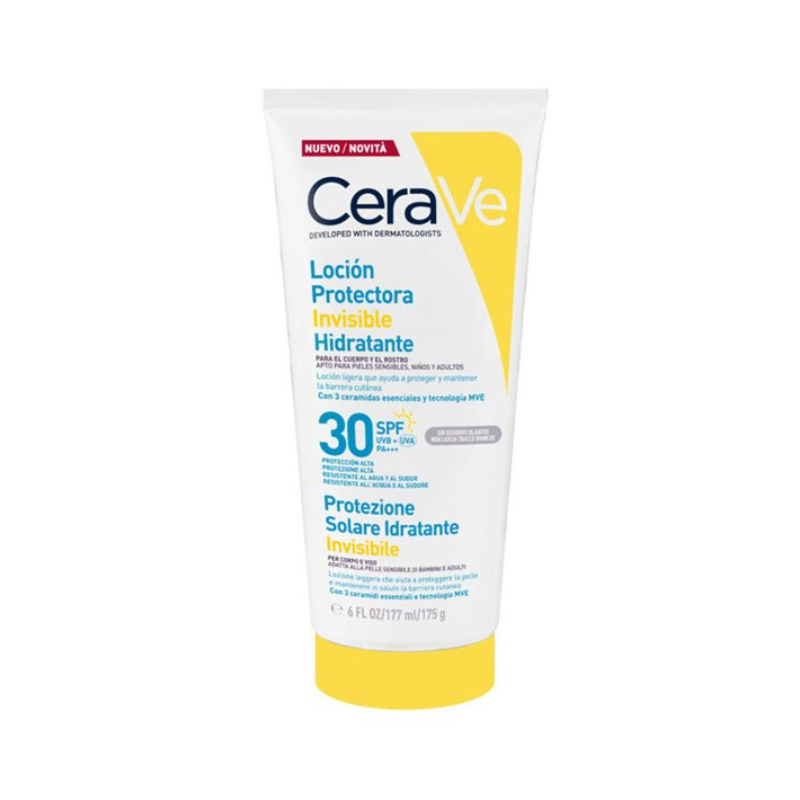 CeraVe Loción Protectora Invisible Hidratante SPF30 177 ml ofrece protección solar de amplio espectro SPF30 frente a rayos UVA y UVB, con textura ligera y acabado invisible. Enriquecida con 3 ceramidas esenciales y tecnología MVE, ayuda a mantener la hidratación y reforzar la barrera cutánea. Resistente al agua, sudor y arena. Sin perfume y no comedogénica.