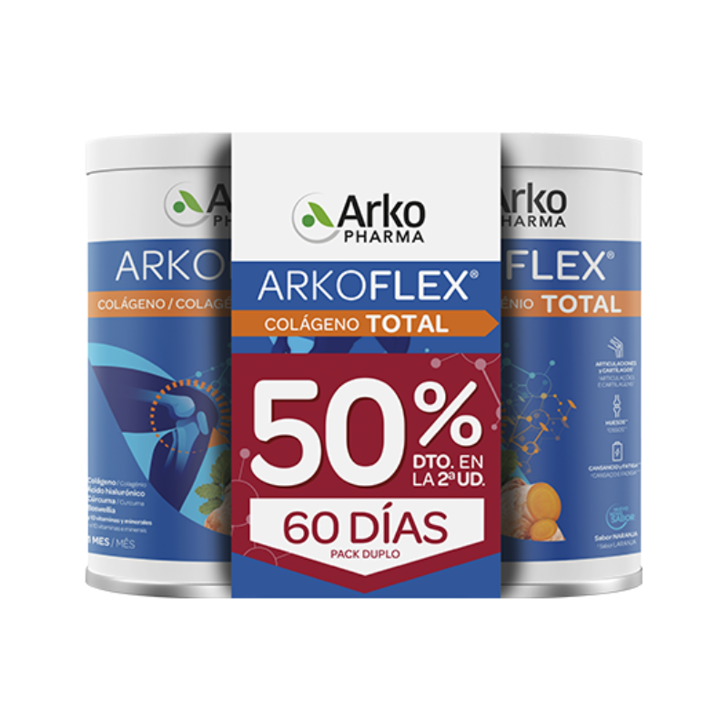 Arkoflex® Colágeno Total es un complemento alimenticio a base de Colágeno hidrolizado y nativo tipo II, Ácido hialurónico, Magnesio, Manganeso, Glucosamina, Condroitina, lithothamnium, Boswellia, Cúrcuma y 7 Vitaminas.
