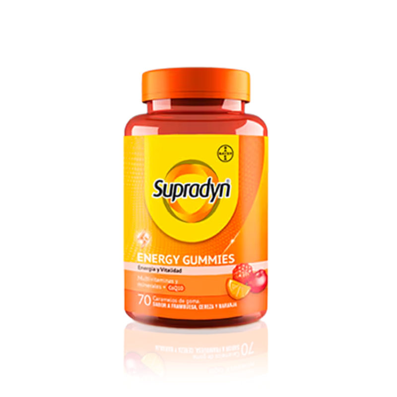 Supradyn® Energy Gummies es una deliciosa forma de tomar vitaminas, que complementa tu dieta habitual. Contiene vitaminas A, B, C y D y la coenzima Q10.