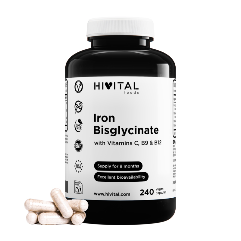 EXCELENTE FÓRMULA a base de Hierro puro vegetal (NO HEMO) en su forma molecular aminoquelada Bisglicinato de máxima absorción, Vitamina B12 en su forma Metilcobalamina, Ácido Fólico en su forma Metilfolato y Vitamina C como L-Ascorbato Cálcico.